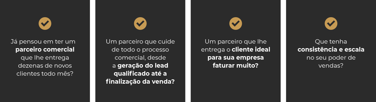 Não cobramos fixo, ajuda de custo, reembolsos de despesas e mínimo garantido. Entramos literalmente no risco com sua empresa e investimos para você vender mais e nos remunerar somente no Sucesso!